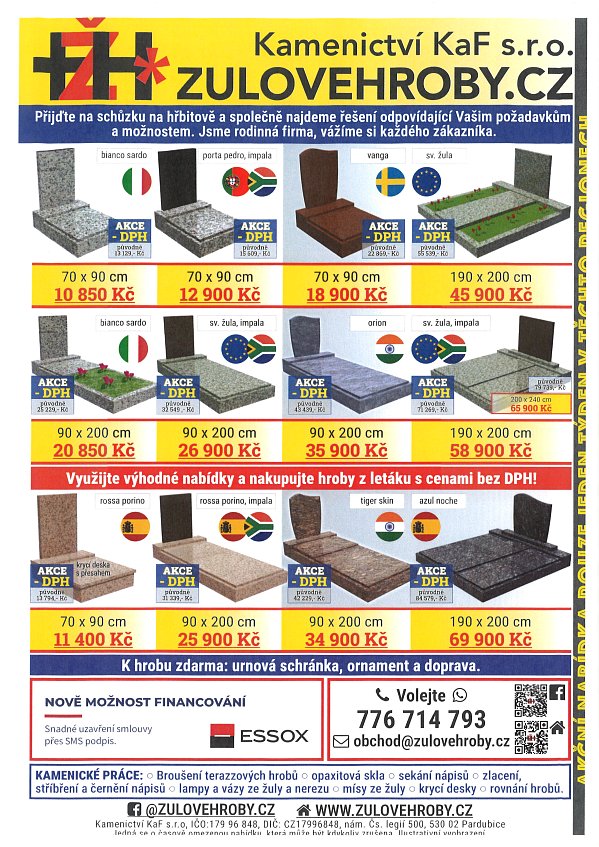 jménem firmy Kamenictví KaF s.r.o. a Žulovéhroby.cz si Vás dovoluji oslovit se žádostí o uveřejnění rozhlasem, popřípadě SMS systémem, pokud máte, že bude v úterý 18. 2. v 13:00 – 13:20 na hřbitově ve Všenorech (Katolický) obchodní zástupce přijímat objednávky k opravám hrobů. Poskytujeme veškeré kamenické práce. Využijte výhodných cen na začátku kamenické sezóny.