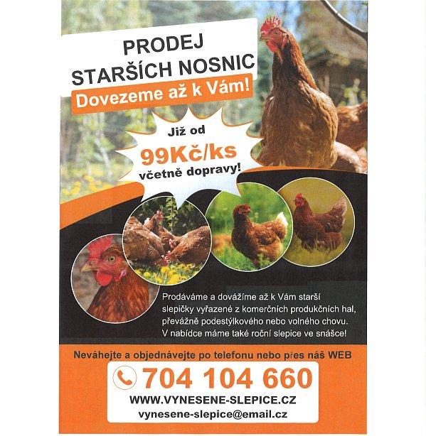 chtěli bychom Vás poprosit o informování chovatelů ve Vaší obci o možnosti objednat si kvalitní starší slepice s dovozem „až do kurníku“. Naši službu velmi vítají především starší občané, pro které je obtížné pro slepice někam jezdit a čekat ve frontách, ale i řada dalších chovatelů, kterým náš servis šetří čas i starosti se sháněním slepic.