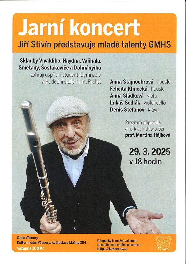 zveme vás na Jarní koncert mladých talentů GMHS, uváděný Jiřím Stivínem. Vstupenky jsou v prodeji v kulturním domě ve Všenorech.