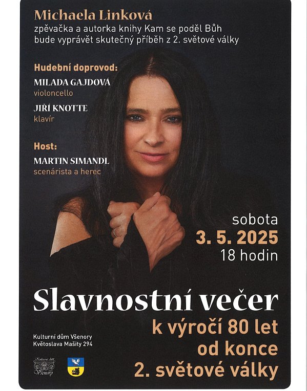 srdečně vás zveme v sobotu 3.5. od 18 hodin na slavnostní večer k 80. výročí konce 2. světové války. Zpěvačka a autorka knihy Kam se poděl Bůh, Michaela Linková, bude vyprávět o této knize. Také zazpívá za hudebního doprovodu Milady Gajdové a Jiřího Knotteho. Účast přijal jako host i scénárista a herec Martin Simandl.
