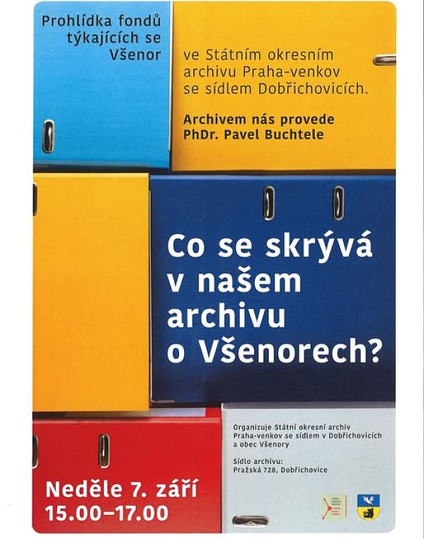 milí a vážení spoluobčané, nenechte si ujít ojedinělou příležitost vidět nevídané dokumenty Státního okresního archivu v Dobřichovicích. Důraz bude kladen na všenorský fond, ale je zde možné vidět třeba i kroniky a další dokumenty jiných obcí. Provázet nás bude PhDr. Pavel Buchtele. Projdeme depozitáře a podíváme se do studovny archivu. Je to příležitost, která se neopakuje.